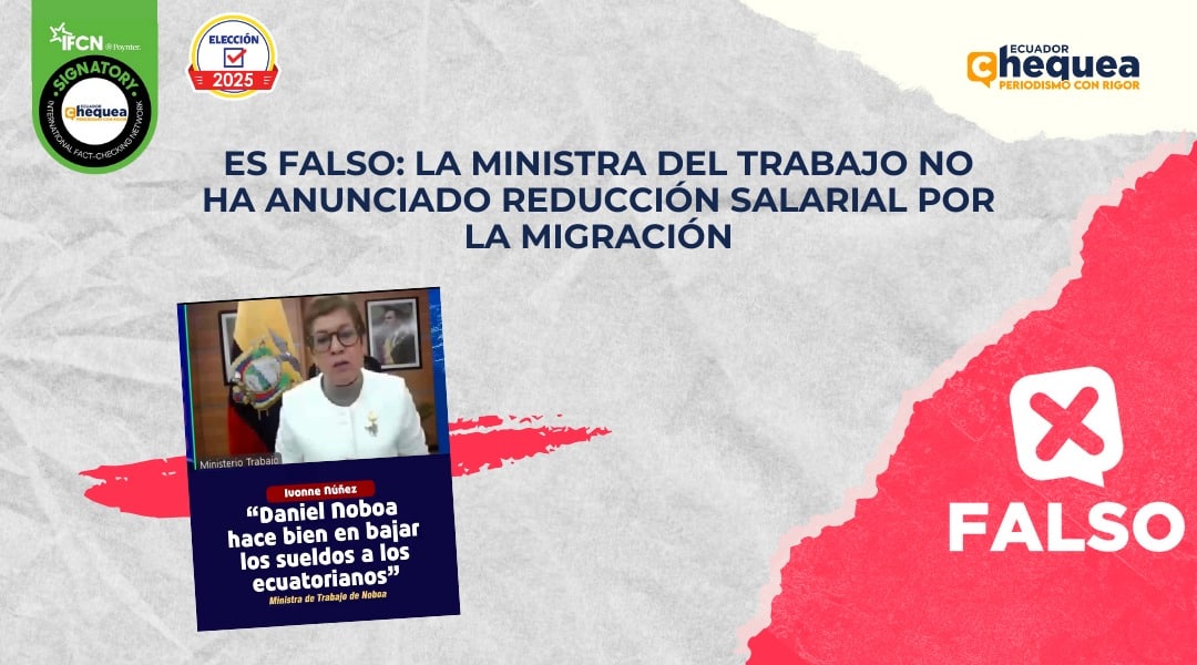 En Facebook, una publicación asegura que la ministra del Trabajo, Ivonne Núñez, habría dicho “que la única forma de generar más empleo es reducir los sueldos de los trabajadores, para ser más competitivos con la mano de obra venezolana que está ingresando a Ecuador” Se califica este contenido como falso. No se ha hecho ningún anunció de que habrá una reducción salarial. La Ministra del Trabajo no se ha referido al tema. La entidad desmintió el contenido. Esta misma cuenta usurpa los logos y tipografía de Ecuador Chequea, haciendo creer que hemos catalogado este contenido como “cierto”.