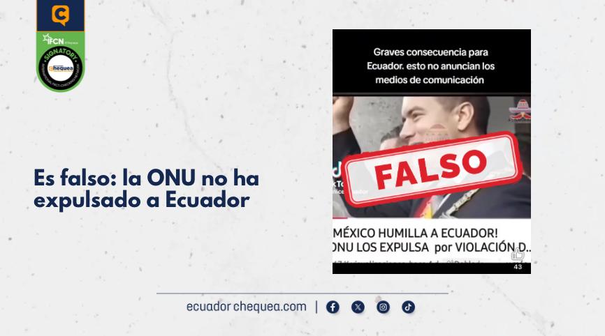 Por ejemplo, una publicación en Facebook asegura que la Organización de las Naciones Unidas (ONU) expulsó a Ecuador por el asalto a la embajada mexicana. Se califica este contenido como falso.