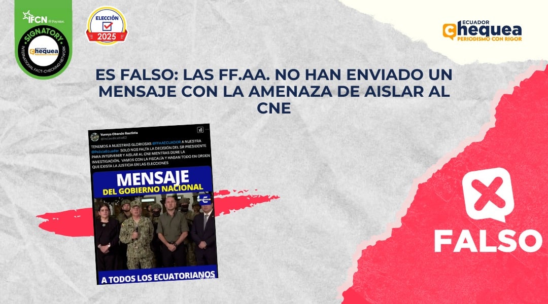 En medio del fluir de números y resultados, la desinformación también se ha abierto paso. Un ejemplo de esto se ve en una publicación realizada en X en la que se dice que las Fuerzas Armadas enviaron un mensaje del Gobierno Nacional a todos los ecuatorianos para intervenir y aislar al CNE para que exista justicia en las elecciones. Calificamos este contenido como falso. El video que ocupa el post es antiguo y data del 9 de enero de 2024. Esta grabación originalmente se dio en el contexto de declaratoria del conflicto armado interno y no está vinculado con el CNE o con las elecciones de 2025.