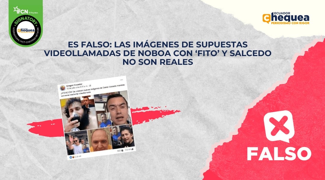 Una publicación en Facebook señala que se viralizan nuevas imágenes de Daniel Salcedo mientras conversa mediante videollamada. En la composición gráfica se visualizan pequeñas imágenes sobrepuestas del presidente, Daniel Noboa. Calificamos este contenido como falso. No hay ningún registro de videollamadas de Salcedo con el presidente Noboa. El collage está editado.