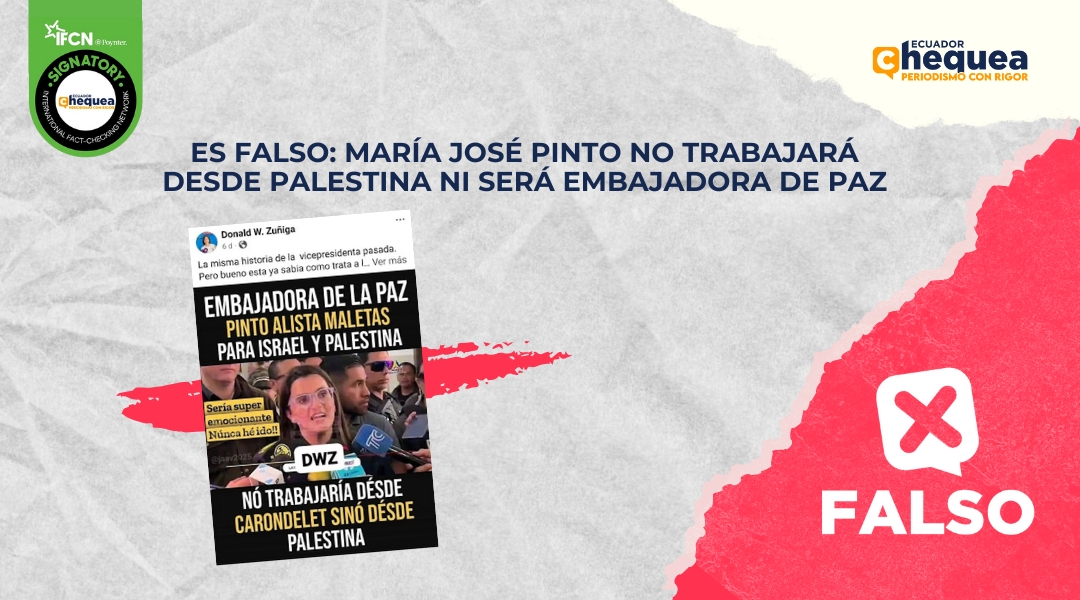 En Facebook, una publicación asegura que la vicepresidenta, María José Pinto, será embajadora de paz y trabajará desde Palestina. Se califica este contenido como falso. A Pinto se le asignaron funciones en el ámbito social. Según el Decreto N.º 3 firmado por Noboa, la Vicepresidenta es responsable de coordinar, dirigir, supervisar y controlar la implementación de políticas públicas integrales así como de planes, programas y proyectos en esta área. Su labor se desarrollará desde el país. Tras meses de haber pasado cerrada la Vicepresidencia con el anterior mandato de Daniel Noboa y Verónica Abad por su tensa relación política, la entidad reabrió sus puertas el 26 de mayo.