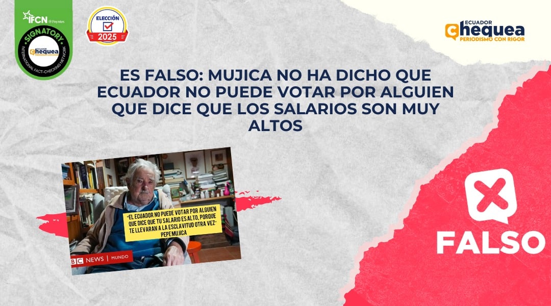 Mientras los días pasan, los contenidos en redes sociales no paran. En Facebook, una publicación asegura que el expresidente de Uruguay, José Mujica, habría dicho que Ecuador no puede votar por alguien que dice que los salarios son muy altos. Se califica este contenido como falso. Mujica no dijo lo que se le atribuye. No hay registros de que el expresidente uruguayo se haya referido a las elecciones presidenciales. Desde hace un mes él no ha dado declaraciones.