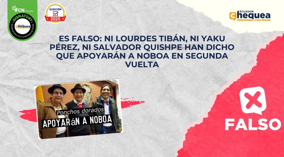 La coyuntura tiene a más de uno pendiente y como era de esperarse la desinformación no para. Una publicación en TikTok asegura que Lourdes Tibán, Yaku Pérez y Salvador Quishpe apoyarán a Daniel Noboa. Ninguno de estos dirigentes se ha pronunciado al respecto. Lourdes Tibán dijo que las declaraciones están descontextualizadas, Pérez dijo que no apoyará a ninguno de los dos candidatos en estas elecciones. Y no hay registros de que Quishpe se haya pronunciado al respecto.