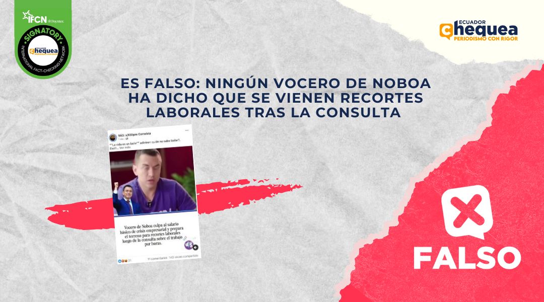 Este hecho ha causado gran revuelo en redes sociales. Al respecto, una publicación en Facebook asegura que el “vocero de Daniel Noboa culpa al salario básico de crisis empresarial y prepara el terreno para recortes laborales, luego de la consulta sobre el trabajo por horas”. Se califica este contenido como falso. Juan Xavier Benedetti no es el vocero de Noboa. En el video no se habla de recortes laborales. Benedetti aseguró que se necesita una reforma laboral que entienda la realidad del siglo XXI. Además, el post presenta un sesgo político.