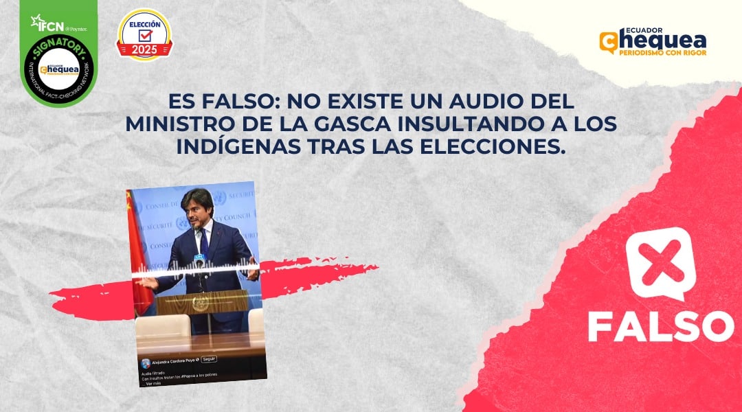 La coyuntura ha tenido a los desinformadores más pendientes. Al respecto, una publicación en Facebook asegura que, mediante audio, el ministro de Gobierno, José de la Gasca, habría dicho: “Daniel a los indígenas no los necesitamos en primera vuelta, menos los vamos a necesitar o buscar en segunda vuelta. Lo importante es que ellos vengan a buscarnos a nosotros y ahí les vamos a dar algunas sobras para que no jodan”. Se califica este contenido como falso. No hay registros de que el Ministro de Gobierno haya dado esa declaración. El audio está realizado con inteligencia artificial. En las recientes declaraciones de De la Gasca no se ha referido a los indígenas. El ministerio de Gobierno desmintió el contenido.
