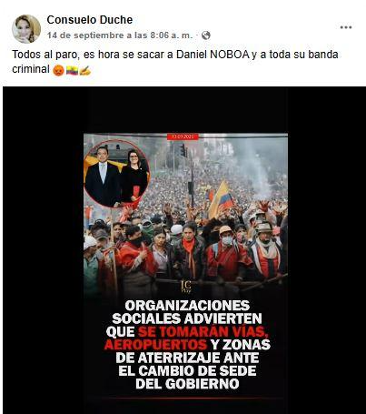 Aquí te traemos un ejemplo: una publicación en Facebook asegura que organizaciones sociales advierten con tomar vías, aeropuertos y zonas de aterrizaje ante el traslado de sede del Gobierno a Latacunga. Esto, sin embargo, es falso.