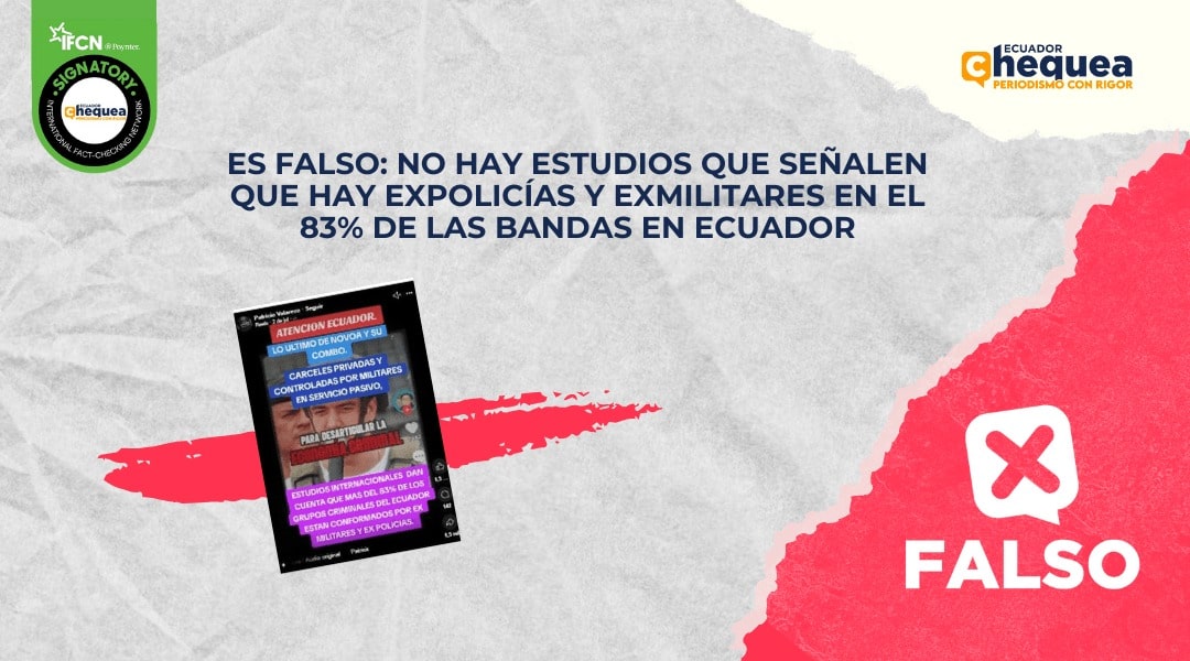 En Facebook, una publicación asegura que el 83% de las bandas criminales en Ecuador están conformadas por expolicías y exmilitares. Se califica este contenido como falso. No existe ningún estudio internacional serio que respalde esa cifra. Es un dato que no ha sido verificado ni publicado por fuentes confiables como organismos de seguridad, académicos o instituciones internacionales. Expertos aseguran que no hay un censo de bandas criminales, por lo que no es posible saber cuántos expolicías y exmilitares estén dentro de esos grupos.