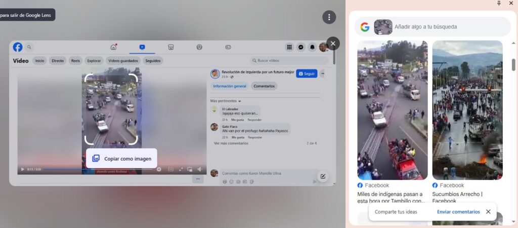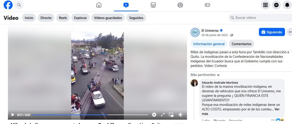 De hecho, se identificó que el video fue publicado inicialmente por El Universo, el 20 de junio de 2022. En ese entonces, varias fotografías y videos fueron compartidos por medios internacionales y nacionales, cuando los manifestantes indígenas entraron por la parroquia Cutuglagua, ubicada en el límite entre Quito y el cantón Mejía, vía considerada estratégica, por ser una de las rutas obligadas del transporte pesado que viene del sur del país.
