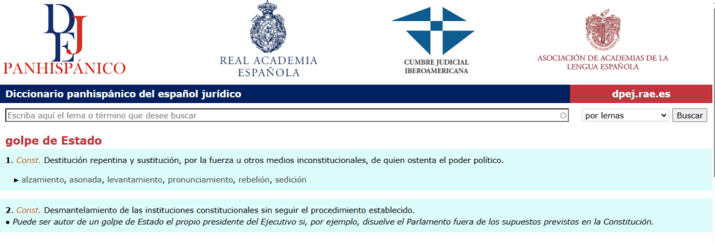 Es importante aclarar qué significa un golpe de Estado. El Diccionario panhispánico del español jurídico respaldado por la Real Academia Española (RAE), define a un golpe de Estado como una “destitución repentina y sustitución, por la fuerza u otros medios inconstitucionales, de quien ostenta el poder político. Desmantelamiento de las instituciones constitucionales sin seguir el procedimiento establecido”.