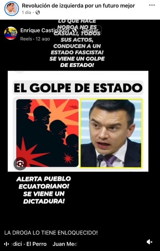 Este tipo de eventos circulan en redes sociales como supuestos hechos para causar conmoción en la ciudadanía. Por ejemplo, en Facebook, una publicación asegura que se viene un golpe de Estado y una dictadura por parte del presidente, Daniel Noboa. Se califica este contenido como falso. No hay evidencia creíble ni reportes recientes que indiquen que en Ecuador se esté dando un golpe de Estado. Aunque ha habido tensiones institucionales, estos escenarios no constituyen un golpe de Estado y tampoco hay una dictadura.