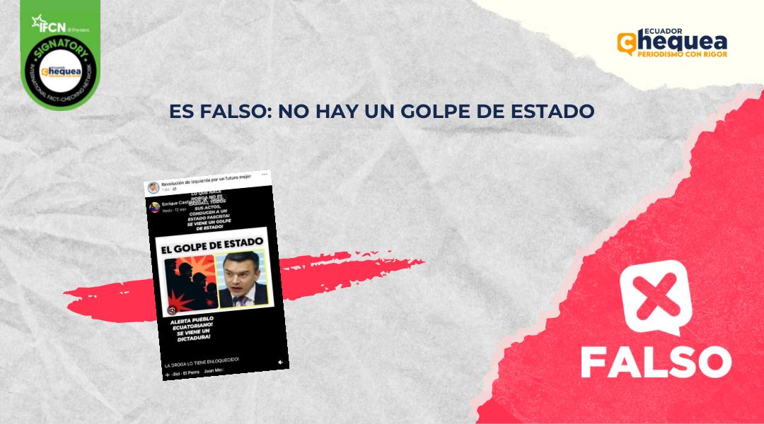 Este tipo de eventos circulan en redes sociales como supuestos hechos para causar conmoción en la ciudadanía. Por ejemplo, en Facebook, una publicación asegura que se viene un golpe de Estado y una dictadura por parte del presidente, Daniel Noboa. Se califica este contenido como falso. No hay evidencia creíble ni reportes recientes que indiquen que en Ecuador se esté dando un golpe de Estado. Aunque ha habido tensiones institucionales, estos escenarios no constituyen un golpe de Estado y tampoco hay una dictadura.
