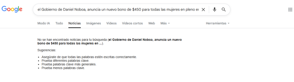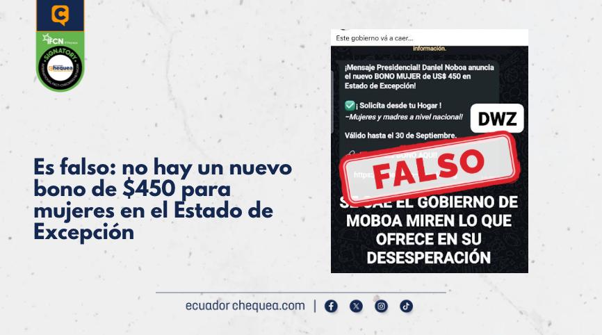 Bajo ese contexto, una publicación en Facebook asegura que el Gobierno de Daniel Noboa anuncia un nuevo bono de $450 para todas las mujeres en pleno Estado de Excepción. Se califica este contenido como falso. No se ha anunciado un bono de $450 para las mujeres. No hay registros en canales oficiales del Gobierno sobre esta falsa iniciativa. La web es un sitio “no seguro”.