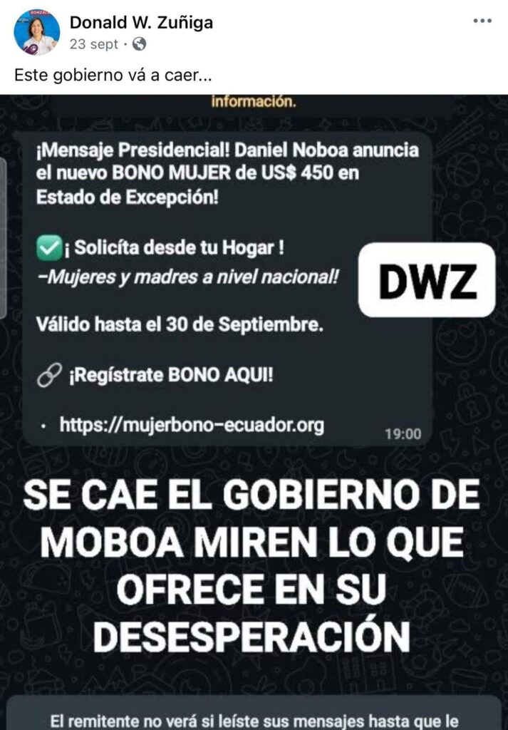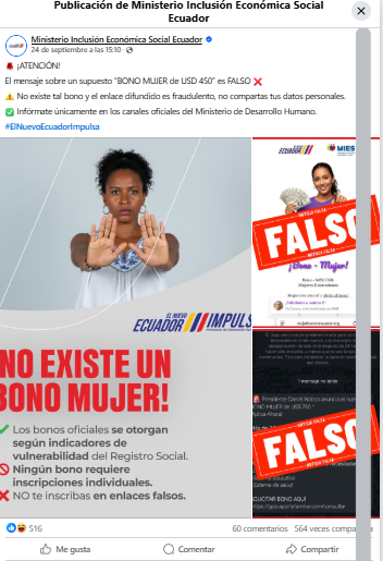 De hecho, el 24 de septiembre, esta cartera del Estado desmintió estos contenidos. “El mensaje sobre un supuesto ‘bono mujer de USD 450’ es falso. No existe tal bono y el enlace difundido es fraudulento, no compartas tus datos personales. Infórmate únicamente en los canales oficiales del Ministerio de Desarrollo Humano”.