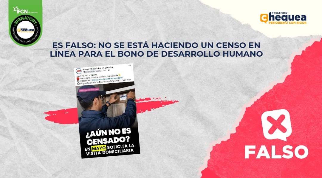 Por ejemplo, una publicación en Facebook asegura que hay un censo en línea para acceder al bono de desarrollo humano. El enlace que acompaña este mensaje dirige a una página web para que los usuarios ingresen sus datos personales. Se califica este contenido como falso. El Ministerio de Inclusión Económica y Social (MIES) no ha anunciado ningún censo en línea para acceder a ese bono. La entrega del bono no requiere llenar formularios a través de enlaces compartidos en redes sociales. El sitio web que circula en la publicación no pertenece una página oficial.