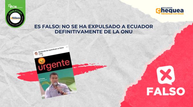 Por ejemplo, una publicación en Facebook asegura que se expulsa a Ecuador definitivamente de la Organización de Naciones Unidas (ONU). Se califica este contenido como falso. La ONU no expulsó a Ecuador por caso de la Embajada de México. De acuerdo con la carta de la ONU, un Estado miembro puede ser suspendido o expulsado sólo si viola de forma persistente los principios fundamentales, mediante una recomendación del Consejo de Seguridad y votación en la Asamblea General. Hasta ahora no hay consenso en el Consejo ni acciones formales de expulsión para Ecuador.