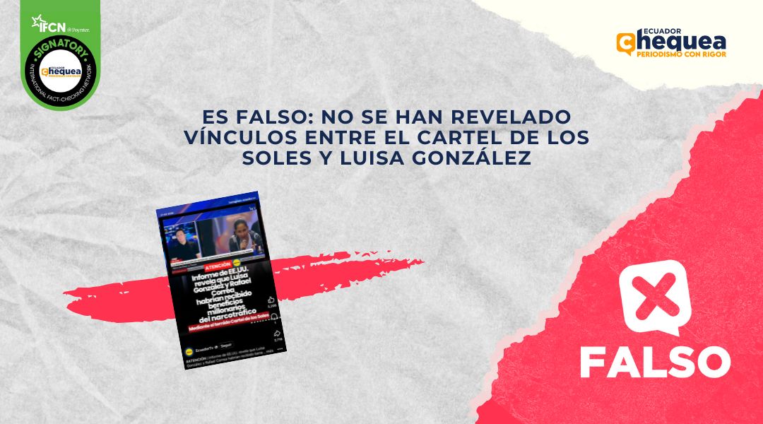 En Facebook, por ejemplo, un post asegura que un informe de la CBS News revela que el Cártel de los Soles financió la campaña política de la excandidata correísta, Luisa González. Se califica este contenido como falso. No hay registros de que el grupo delictivo haya financiado la campaña de González. Ningún medio de comunicación ha reportado este hecho. El contenido no presenta evidencia de lo que asegura.