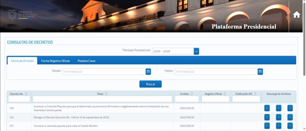 Frente al contenido, Ecuador Chequea revisó la página oficial de la Presidencia, específicamente, la sección de decretos y no encontró ningún documento que haga referencia a un incremento en el costo de los pasajes urbanos e interprovinciales. Cabe recordar que, en ocasiones anteriores, cuando el Primer mandatario establece una orden, se publica en este registro.