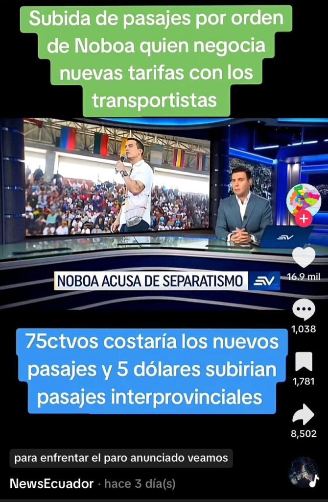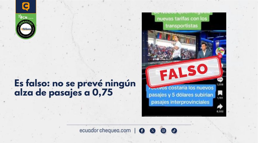 Bajo este contexto, una publicación en TikTok asegura que los pasajes subirán a 75 centavos y los interprovinciales a 5 dólares por orden de Daniel Noboa. Se califica este contenido como falso. No hay ninguna orden de subir los pasajes. Noboa no ha emitido ningún decreto al respecto. Por su parte, el Gobierno ha dicho que los pasajes no subirán, debido al “incentivo productivo” que otorgan a los transportistas de transporte urbano e interprovincial.