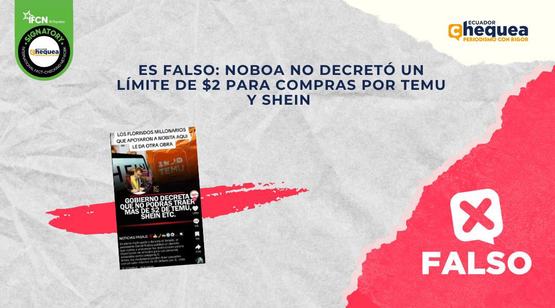 El hecho ha sido usado por los desinformantes para hacer de las suyas. Una publicación en TikTok asegura que el Gobierno de Daniel Noboa firmó un Decreto que solo permite traer compras por $2 en Shein y Temu. Se califica este contenido como falso. No hay ningún decreto con restricción a compras de Temu o Shein. Mediante el Decreto 82, el Gobierno implementó un nuevo régimen de importación para bienes de uso personal, exento de tributos, que aplicará a paquetes cuyo peso no supere los 2 kilogramos y cuyo valor sea de hasta $2.