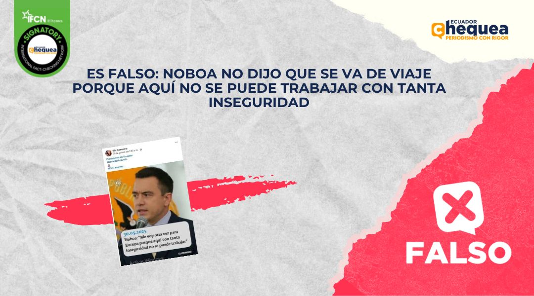 Bajo este contexto, la desinformación ha empezado a hacer de las suyas. Por ejemplo, una publicación en Facebook asegura que el presidente, Daniel Noboa, habría dicho: “Me voy otra vez a Europa, porque aquí con tanta inseguridad no se puede trabajar”. Todo esto acompañado de los logos y tipografía de diario El Universo. Se califica este contenido como falso. No hay registros de que el presidente Noboa haya asegurado lo que se le atribuye. La publicación no pertenece a El Universo y está editada. Noboa estará 16 días fuera de Ecuador por una gira internacional y asuntos personales. Se trata del primer viaje en lo que va de su segundo mandato y regresará el 7 de julio.