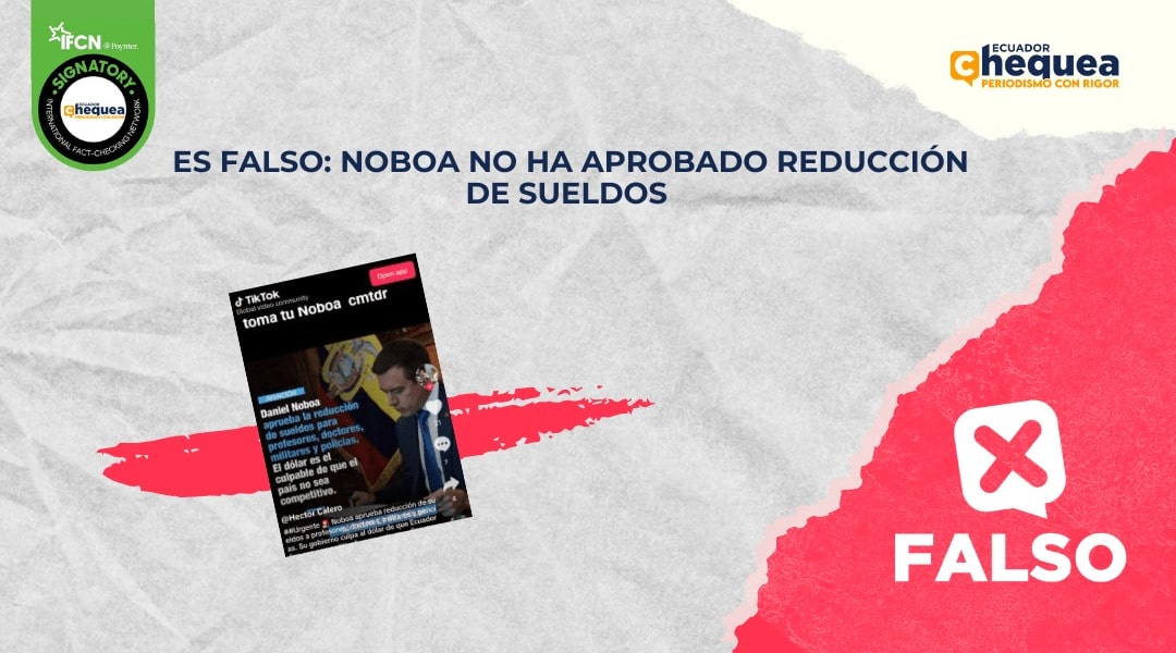 Al respecto, un video en TikTok asegura que el presidente, Daniel Noboa, aprobó una reducción de sueldos a profesores, médicos, militares y policías. Todo esto acompañado de la tipografía de Primicias. Se califica este contenido como falso. No hay ninguna orden del presidente Noboa sobre reducción de sueldos. Tampoco se ha emitido ningún decreto al respecto. La publicación circula desde marzo. El contenido usurpa la tipografía de Primicias.