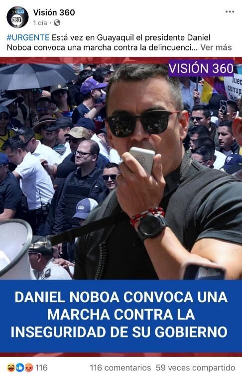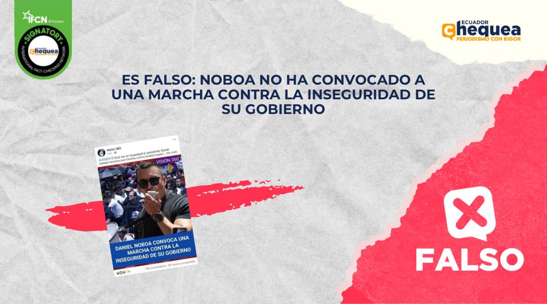 Una publicación en Facebook asegura que Daniel Noboa convoca a una marcha contra la inseguridad de su Gobierno. Se califica este contenido como falso. La marcha convocada por Noboa-según señaló- es por la paz y la justicia. El Primer mandatario hizo la convocatoria para el 11 de septiembre, en Guayaquil. Para ese mismo día, los sectores sociales también tienen una convocatoria a una movilización contra el Gobierno.