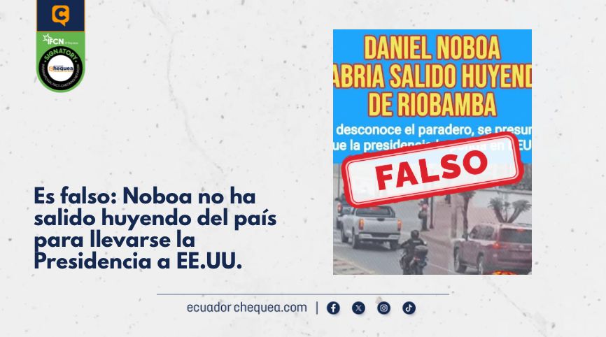 El hecho ha tenido a la desinformación más activa que nunca y los contenidos falsos no paran. Por ejemplo, en Facebook una publicación asegura que Noboa habría salido huyendo desde Riobamba y se llevaría la Presidencia a Estados Unidos. Se califica este contenido como falso.
