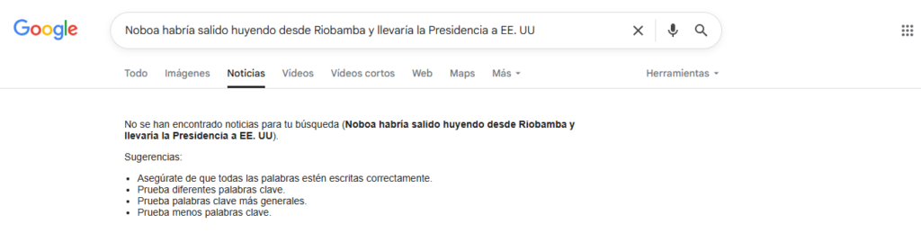 Ecuador Chequea colocó la misma frase en el buscador de Google, pero, no se encontró ningún reporte de prensa, que hable sobre que el Presidente, Daniel Noboa “huyó de Riobamba”.