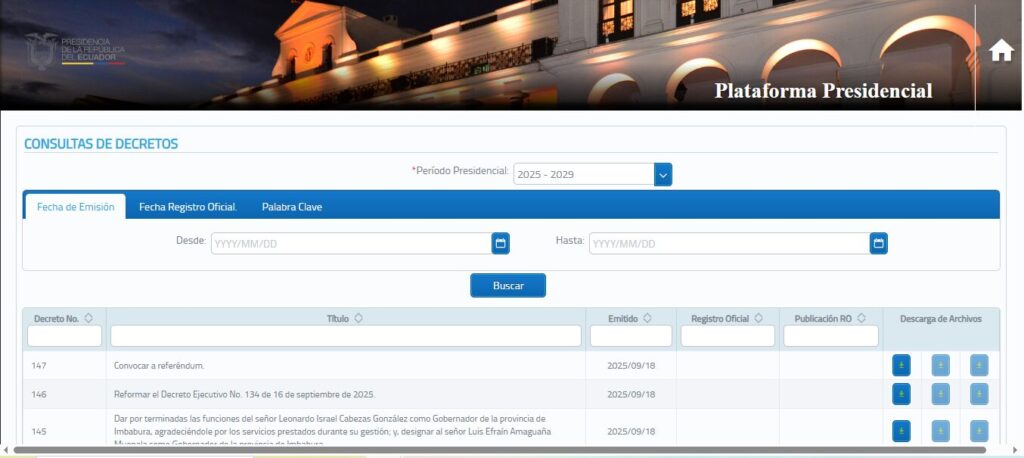 Posterior a esto, se revisó la página de la Presidencia, en la sección Decretos, no se evidencia ningún documento que hable sobre un cambio de la sede del Ejecutivo, como quiere hacer creer el contenido a verificar.