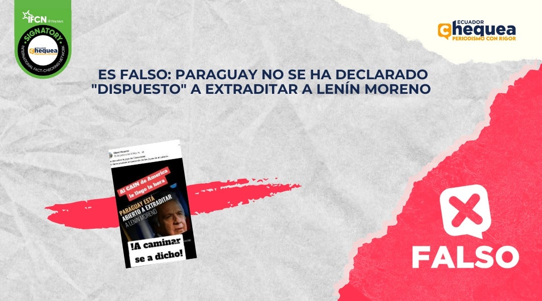 En Facebook, una publicación asegura que Paraguay está dispuesto a extraditar al expresidente, Lenín Moreno. Se califica este contenido como falso. Actualmente, no hay una orden de captura ni un pedido formal de extradición de Lenín Moreno. La publicación es antigua y data del 10 de marzo de 2023. Desde ese año, el expresidente está procesado por el presunto delito de cohecho por el caso ‘Sinohydro’. Moreno tiene medidas sustitutivas y actualmente está cumpliendo con la presentación en la Embajada de Ecuador, en Paraguay, por ello la Fiscalía desistió de su pedido inicial de prisión preventiva.