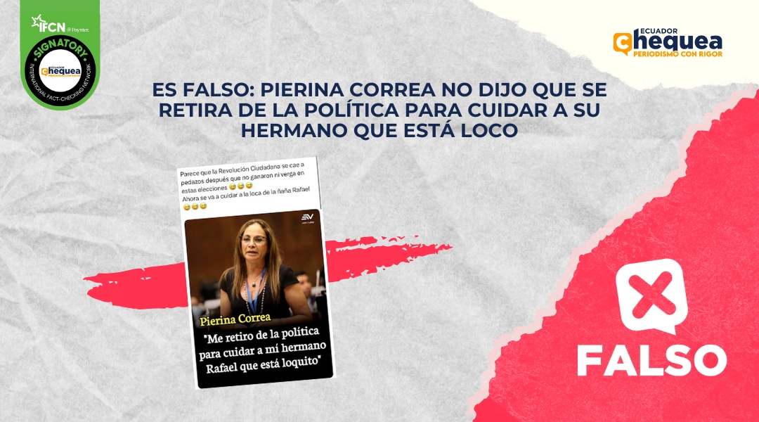 Una publicación en X asegura que la exasambleísta de la Revolución Ciudadana, Pierina Correa, habría dicho: “Me retiro de la política para cuidar a mi hermano Rafael (Correa) que está loquito”. Esta publicación está acompañada de los logos de Ecuavisa. Se califica este contenido como falso. No hay registros de que Correa haya dado la declaración que se le atribuye. El contenido no fue realizado por Ecuavisa. Pierina Correa anunció su retiro definitivo de la política, luego de que la Asamblea no aprobara el proyecto de Código Orgánico de Protección Integral a Niñas, Niños y Adolescentes (Copinna).