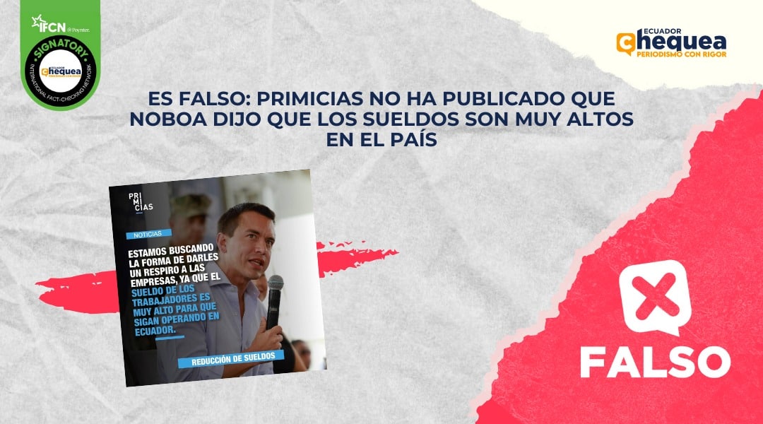Un ejemplo de esto se puede encontrar en una publicación realizada en Facebook. Esta asegura que Primicias habría publicado que el presidente-candidato, Daniel Noboa, habría dicho que se está buscando la forma de dar un respiro a las empresas porque el sueldo de los trabajadores es muy alto. Calificamos este contenido como falso. El medio no publicó este contenido ni hizo referencia a la supuesta frase de Noboa.