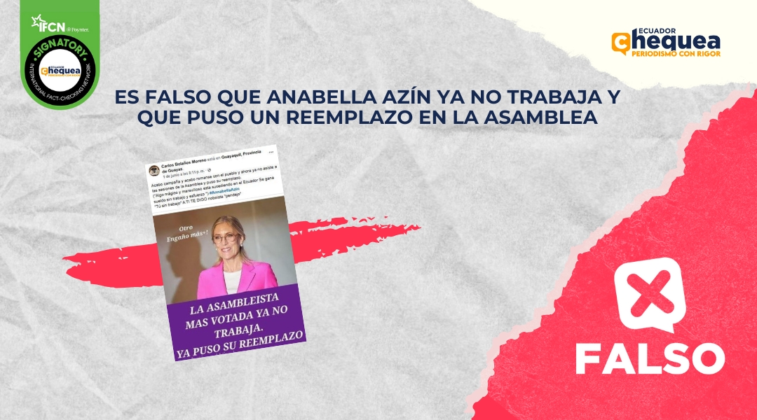 Al respecto, una publicación en Facebook asegura que la asambleísta de ADN y madre del presidente Daniel Noboa, Anabella Azín ya no trabaja en el Legislativo y que ya puso un reemplazo. Se califica este contenido como falso. Azín no ha presentado su renuncia, ella continúa en funciones como asambleísta nacional desde el 14 de mayo. Sin embargo, registra inasistencias en el actual periodo legislativo. Desde su posesión, ha asistido únicamente a tres sesiones del Pleno: una con motivo de la investidura de su hijo, el presidente Daniel Noboa, otra a la que llegó con retraso y la más reciente, correspondiente al segundo debate del proyecto de reforma parcial al artículo 5 de la Constitución de la República, que sucedió ayer.