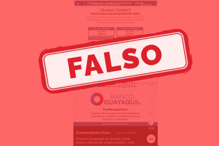 En redes sociales circula una publicación de la página “Convocatorias Ecuador” en TikTok que difunde una imagen con supuestas vacantes laborales del Banco de Guayaquil y salarios asociados a cada cargo. Entre los puestos ofertados constan, entre otros: Operador de Call Center (USD 900), Auditor Interno (USD 1.800), Asistente de RR.HH. (USD 1.200), Analista de Crédito (USD 1.350) y Cajero Bancario (USD 1.100).