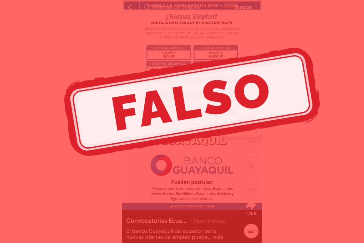 La publicación que circula en TikTok con supuestas vacantes laborales del Banco de Guayaquil y salarios específicos es falsa. Tras revisar la imagen mediante búsqueda inversa y contrastar la información con los canales oficiales de reclutamiento del banco, se comprobó que la entidad no ha difundido esas ofertas de empleo.