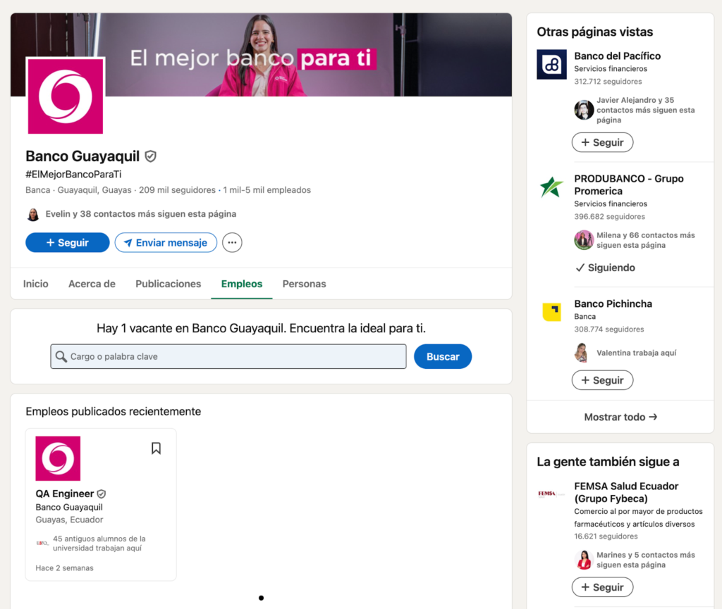 Actualmente, el Banco de Guayaquil solo mantiene una vacante activa en su cuenta oficial de LinkedIn, correspondiente a QA Engineer, sin detalles salariales públicos.