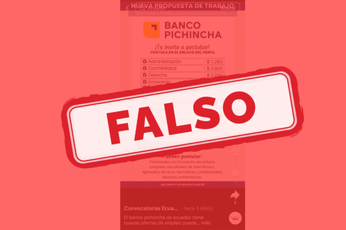 Esta no es la primera vez que circulan falsas ofertas laborales atribuidas a Banco Pichincha. Ecuador Chequea ha verificado anteriormente contenidos similares difundidos en redes sociales por páginas sin relación con la entidad.