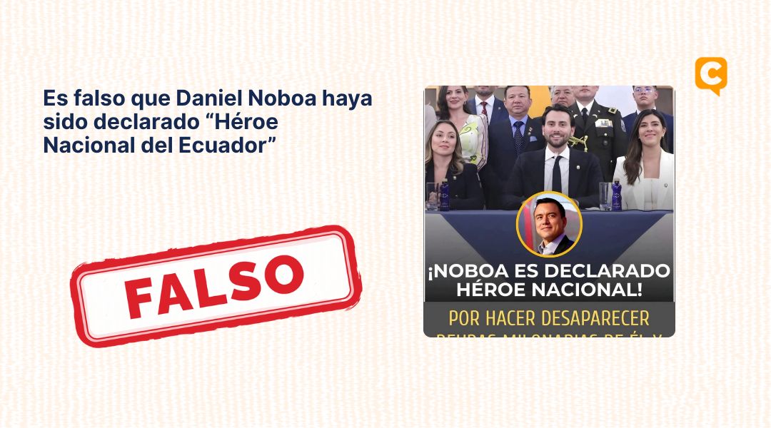 - Lo que afirma: “Daniel Noboa fue declarado Héroe Nacional del Ecuador por desaparecer deudas millonarias de sus amigos”.