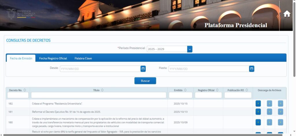 Una revisión del Registro Oficial, del portal Gobierno del Ecuador, no se evidencia ningún Decreto Presidencial que hable al respecto.