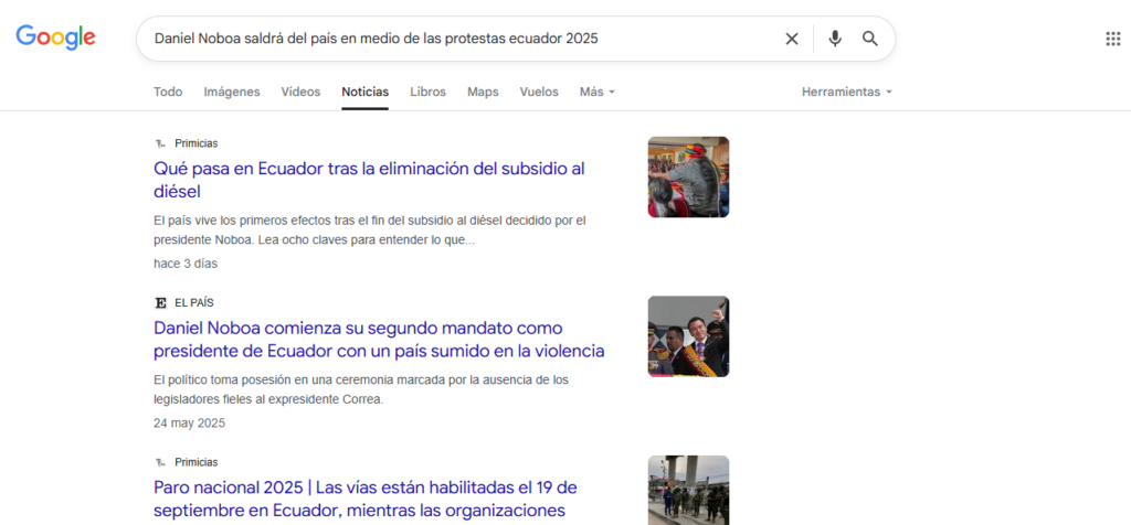 Ahora, al colocar en Google la misma frase a verificar, no se encontró ningún reporte de medios de comunicación que hablen al respecto. De hecho, los distintos medios reportan que Noboa se mantiene activo en el país, en actividades oficiales.