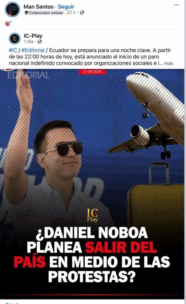 Una publicación en Facebook sugiere —aunque lo coloque entre signos de interrogación— que el presidente, Daniel Noboa, podría salir del país en medio de las protestas. Se califica este contenido como falso.