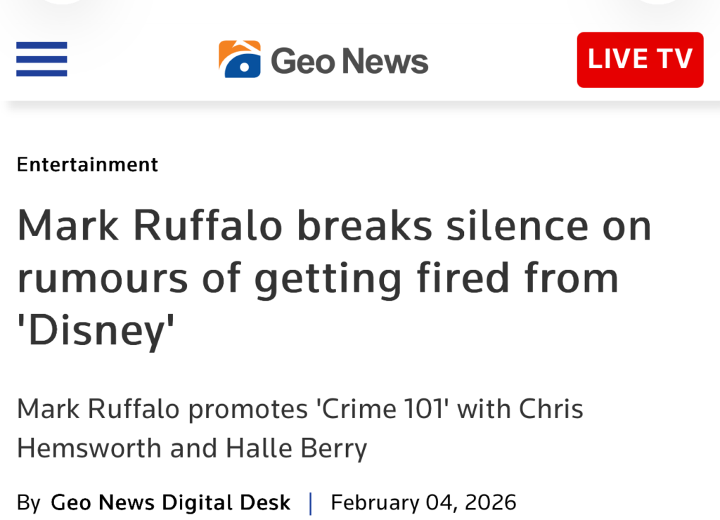 El 28 de enero de 2026, en portales digitales de entretenimiento, “First Curiosity”, “Marvel Mania”, comenzó a circular un contenido que señalaba que el actor Mark Ruffalo habría sido despedido de Disney.