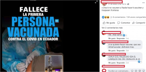 En redes sociales circula una publicación sobre una supuesta muerte de una persona tras recibir la vacuna contra la COVID-19 en Ecuador. La información difundida a través de cuentas personales es falsa.