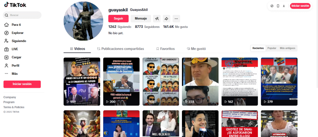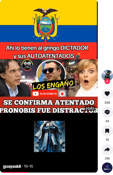 El video fue publicado el 15 de octubre por el usuario “guayaskil” en TikTok, reutilizando fragmentos de un material alojado previamente en YouTube (Radio Face TV Ecuador). El post no presenta evidencia empírica que respalde la hipótesis del “autoatentado” y se inserta en una narrativa política claramente opositoria.