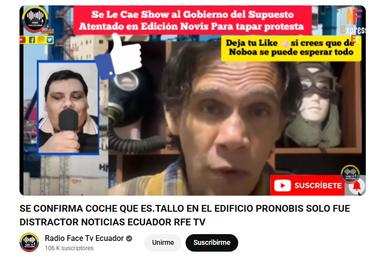 No obstante, dicho video también carece de sustento y evidencia que respalden la afirmación presentada. De hecho, la persona que aparece en las imágenes expresa únicamente su opinión personal, sin ofrecer pruebas que confirmen que el coche bomba ocurrido el 14 de octubre haya sido un autoatentado perpetrado por Daniel Noboa.
