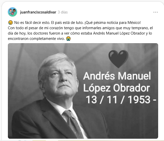 Aunque hacia el final del mensaje se afirma que López Obrador está vivo, la introducción y la estructura del contenido pueden llevar a muchos usuarios a sacar conclusiones precipitadas sin leer el texto completo.