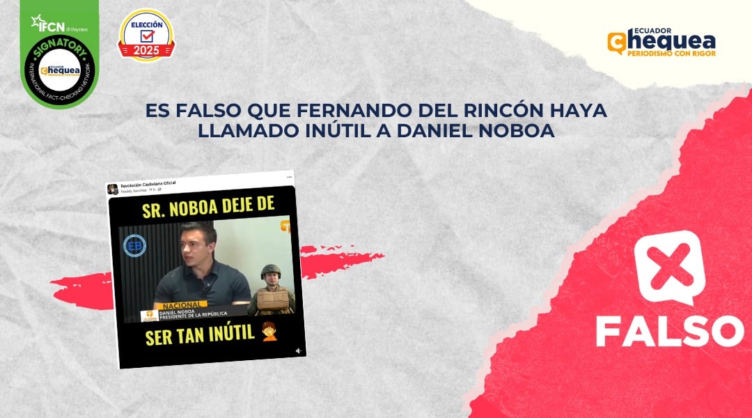En Facebook, por ejemplo, una publicación asegura que el periodista de CNN Fernando del Rincón le habría dicho al presidente-candidato, Daniel Noboa, que deje de ser inútil. Se califica este contenido como falso. El video está editado. No hay registros de que Del Rincón haya dado la declaración que se le atribuye. El clip original corresponde a una crítica que hizo el periodista al al expresidente Guillermo Lasso y ocurrió en 2022.