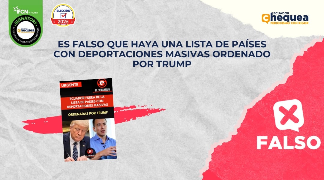 El lunes, Donald Trump asumió oficialmente su cargo como presidente de Estados Unidos. Desde entonces ha firmado más de 40 Órdenes Ejecutivas. Una publicación en Instagram asegura que Ecuador está fuera de la lista de países con deportaciones masivas por órdenes de Trump. Se califica este contenido como falso. En Estados Unidos no hay una lista de países para las deportaciones masivas. Las autoridades estadounidenses dicen que cualquier persona que se encuentre de manera ilegal dentro del país norteamericano puede ser deportada a través de las redadas o cualquier operativo que se realice sin importar la nacionalidad.
