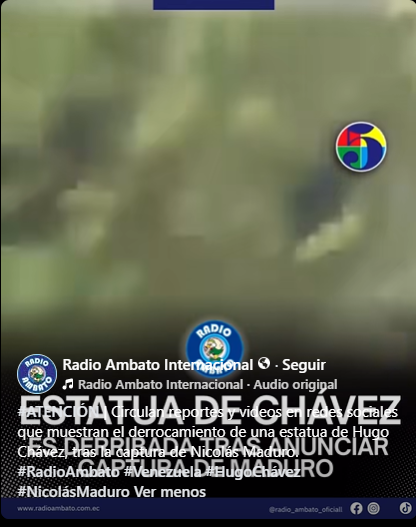 El contenido es FALSO. La captura de pantalla corresponde a un video sin contexto verificable, con marca de un medio ecuatoriano, que no muestra ni prueba el retiro de una estatua de Hugo Chávez en Venezuela ni su relación con la captura de Nicolás Maduro. Además, no existe respaldo oficial ni periodístico que confirme ese hecho. El material reutiliza imágenes ambiguas para construir un relato que no está sustentado en evidencia.