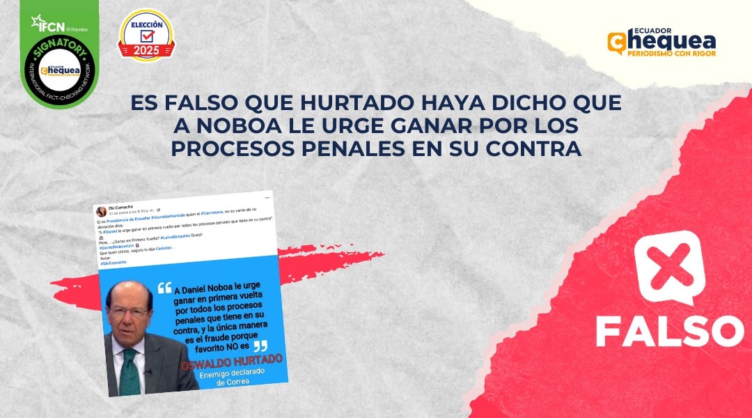 El contenido no presenta evidencias de lo que asegura y, después de un extenso monitoreo en redes sociales, se identificó que el expresidente Hurtado mantuvo una entrevista el 9 de enero, con Ecuavisa. En el espacio analizó la situación jurídica que atraviesa el país, marcada por discrepancias sobre la interpretación de las leyes en medio de tensiones entre el presidente y la vicepresidenta.